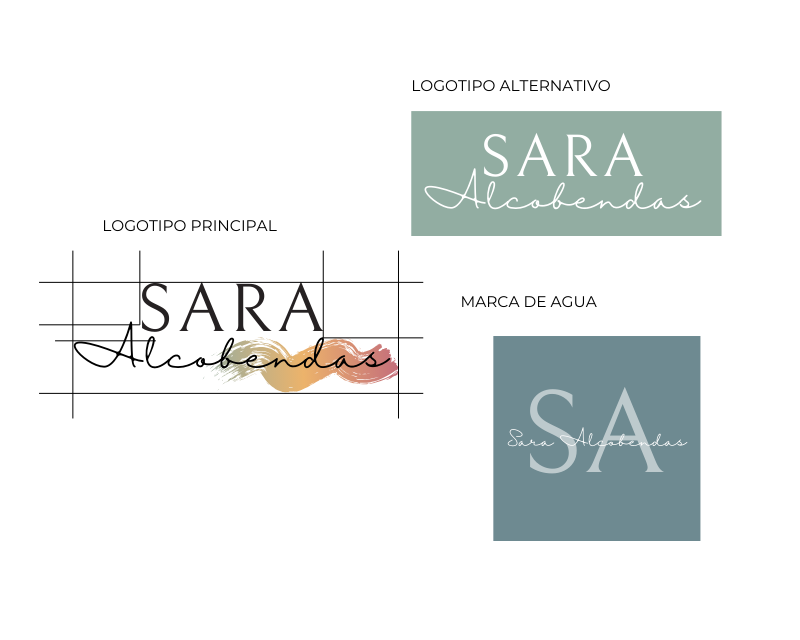 Para Sara Alcobendas nos decantamos por un logotipo que combina tipografía y símbolo, unas pinceladas de brocha, fluidas y expresivas, que enlazan el nombre de la artista con el concepto central de su identidad visual. Estos trazos no solo aportan personalidad, sino que también refuerzan la conexión con el arte y la creatividad que definen su marca.